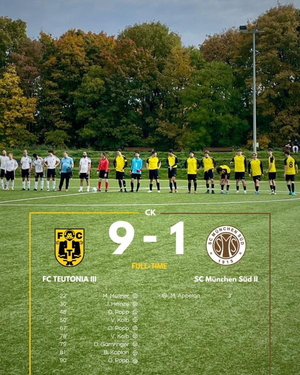 Ein erfolgreicher Sonntag für den FC Teutonia München: Nachdem bereits die erste und zweite Herrenmannschaft jeweils drei Punkte eingefahren hatten, wollte die dritte Mannschaft den „9-Punkte-Sonntag“ perfekt machen – und das gelang nach anfänglichem Tiefschlaf mit einem echten Offensivfeuerwerk. Am Ende siegte das Team von Trainer Lucas Biller gegen den SC München Süd II hochverdient mit 9:1.